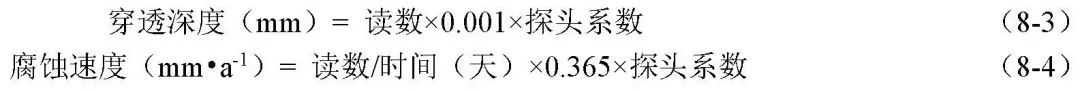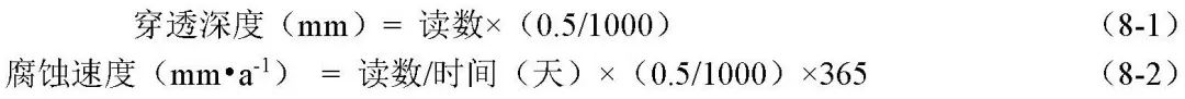 平衡電位器是這樣選擇的,其刻度范圍為0~1000,此范圍與探頭元件的有效金屬損失相對(duì)應(yīng)。例如,一個(gè)絲狀探頭元件,厚2.0mm,此探頭的有效厚度損失為1.0mm,這相當(dāng)于在元件周圍0.5mm的穿透深度。因而,將0.5mm的金屬損失與平衡電位器上刻度的變化相對(duì)應(yīng),經(jīng)過一段時(shí)間之后的穿透深度(總腐蝕)或者平均腐蝕速度可由下述關(guān)系確定: